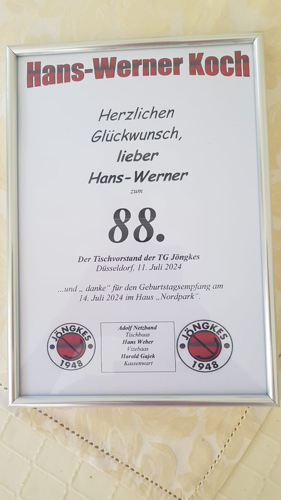 Gleichzeitig sollte der Alterspräsident der TG Jöngkes, Hans-Werner Koch, über 45 Jahre Vereinsmitglied, für seine Verdienste und vielen ehrenamtlichen Einsätze bei den Düsseldorfer Jonges geehrt werden. Dazu hat sich der Tischvorstand der TG Jöngkes entschieden.