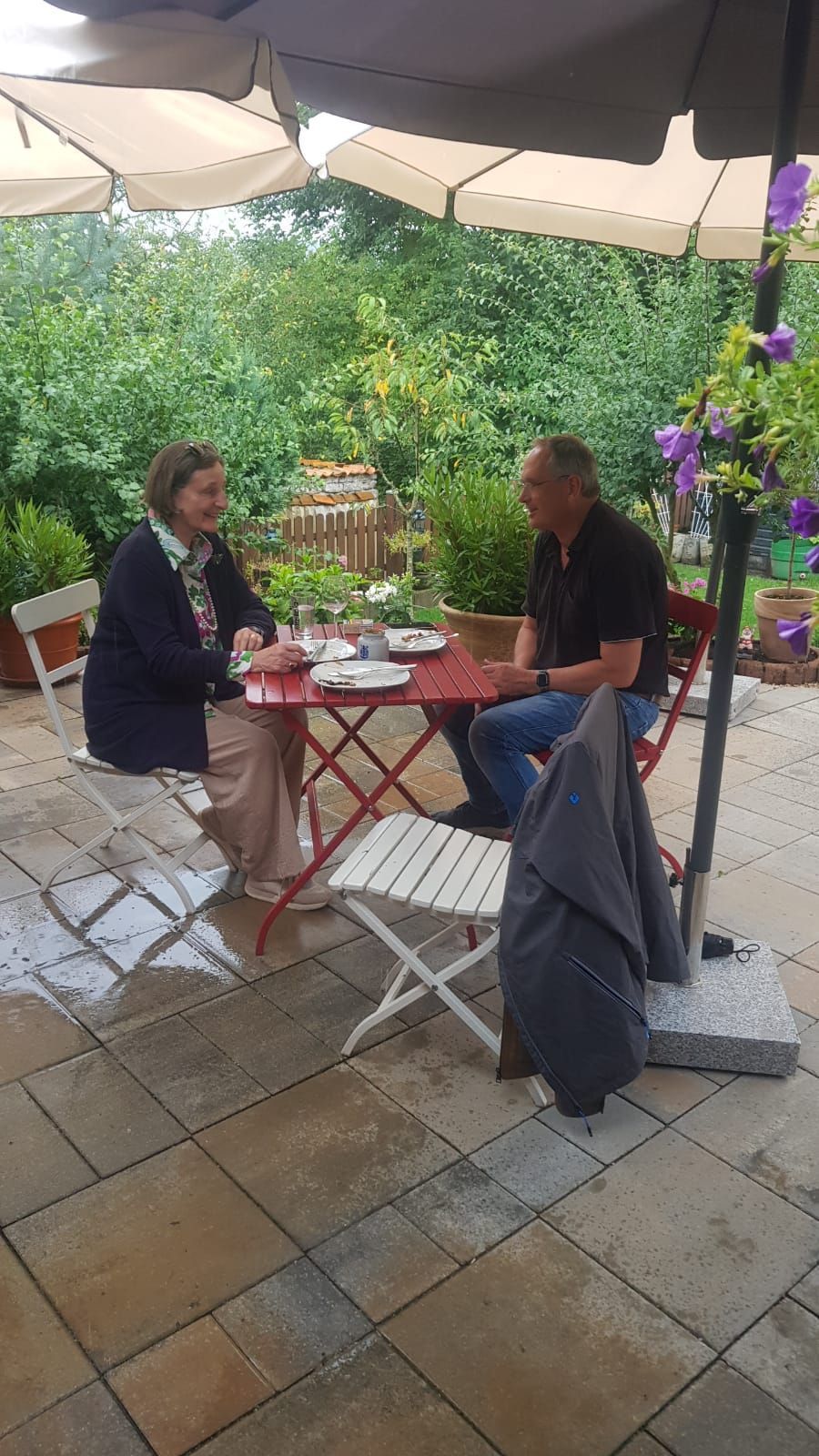 Aber die grosse Abordnung der Jöngkes mit ihren Frauen konnte sich nach der "Schlossführung" von Hans überzeugen, ein anheimelndes und aufwendiges Heim in einem alten Kleinhof geschaffen zu haben. Innen wie aussen atmeten wir zwar noch den ursprünglichen Charme einer alten Eifelzeit ein, die aber mit Leidenschaft, Kreativität und modernen Ideen in die Neuzeit verwandelt wurde. Die neu geschaffene Terrasse sollte für uns, auch bei leicht feuchtem Regenwasser, der Mittelpunkt unseres Besuches sein. Eingesäumt von Blumen und viel Grün wurden wir mit herrlichem Eifelkuchen verwöhnt. Die geplante Wanderung mit alkoholbeladenem Bollerwagen endete wegen Starkregen bereits in der nächsten, überdachten Bushaltestelle. Währenddessen wurde bei den Webers auf dem Weber-Grill ein Wildschwein zum Verzehr vorbereitet. Mit allerlei leckerem Zubehör sorgte der Verzehr der Portionen für appetitliche Stille, die erst danach in eine ausgelassene Stimmung ausartete.